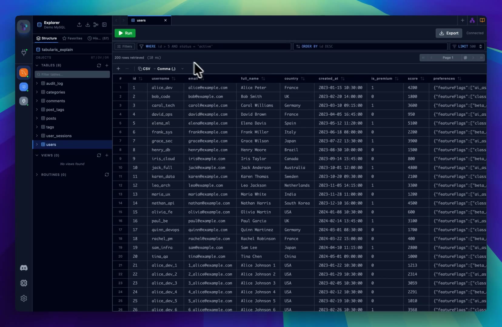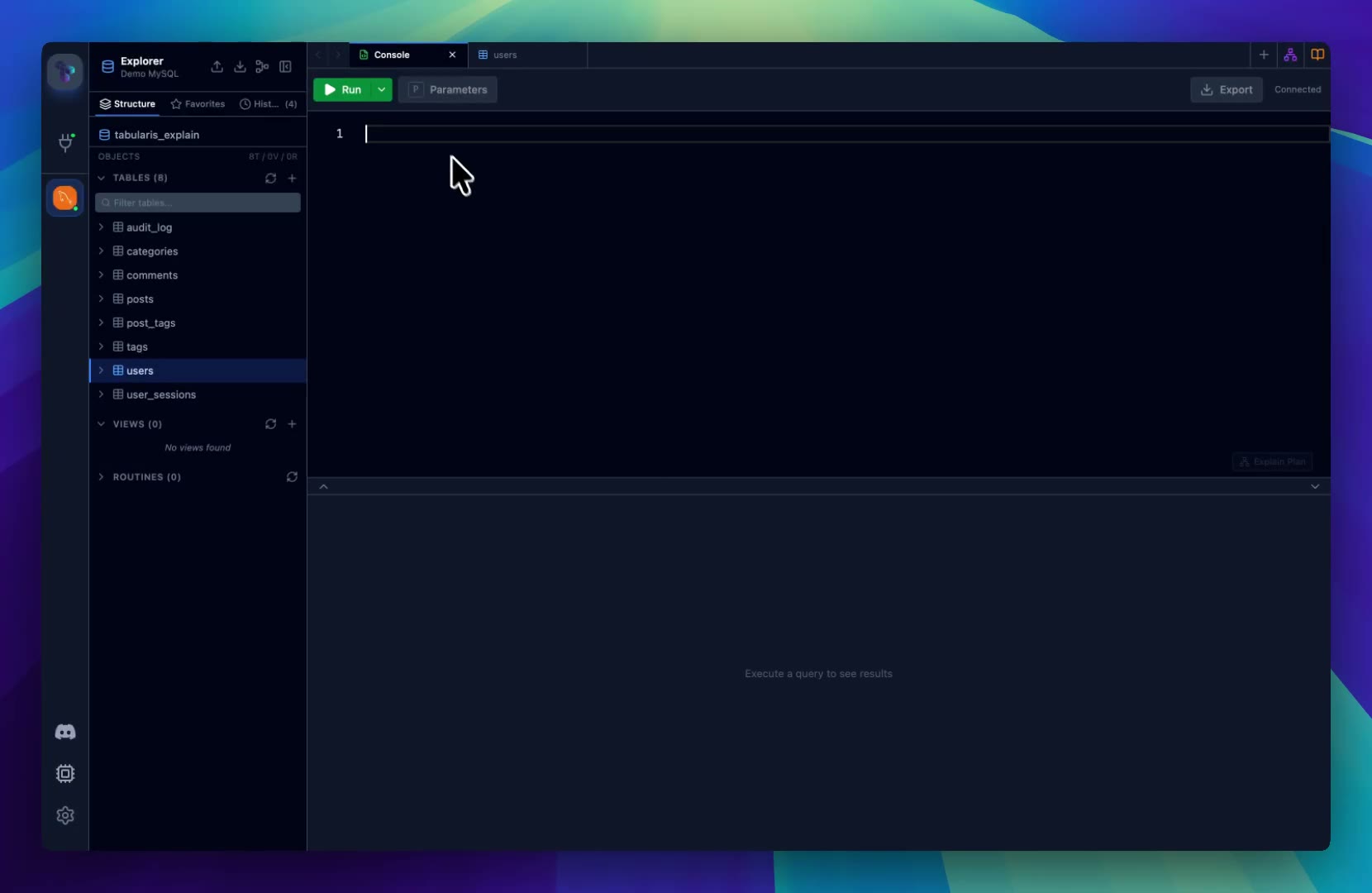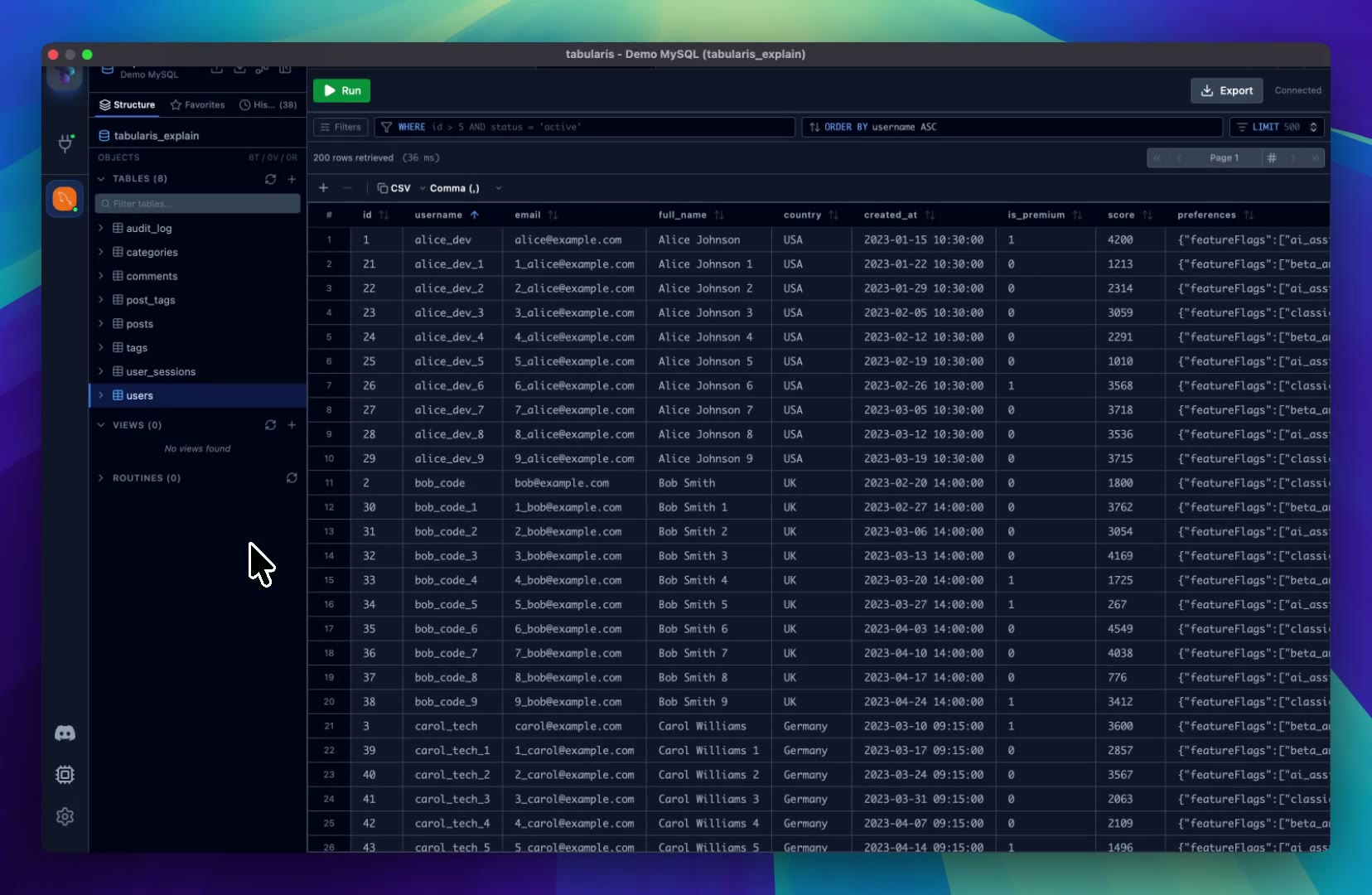 DemoModern SQL Editor WorkflowSee how the SQL editor, result grid, execution controls, and query workflow fit together inside Tabularis.