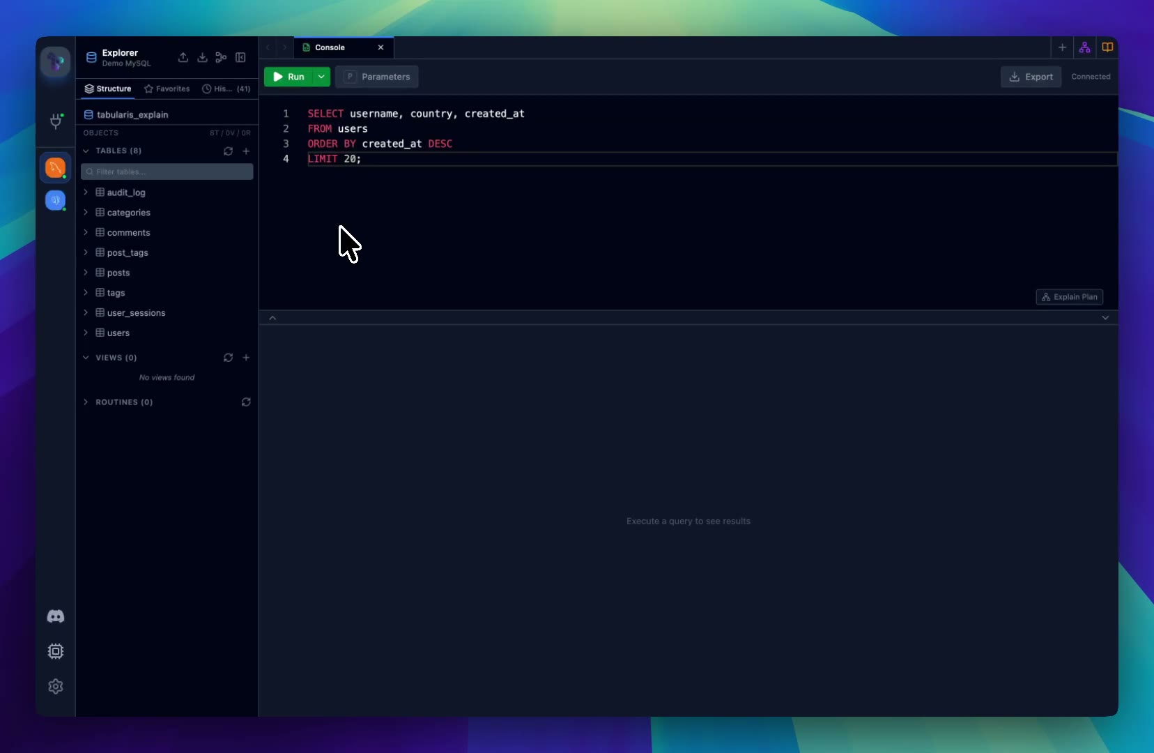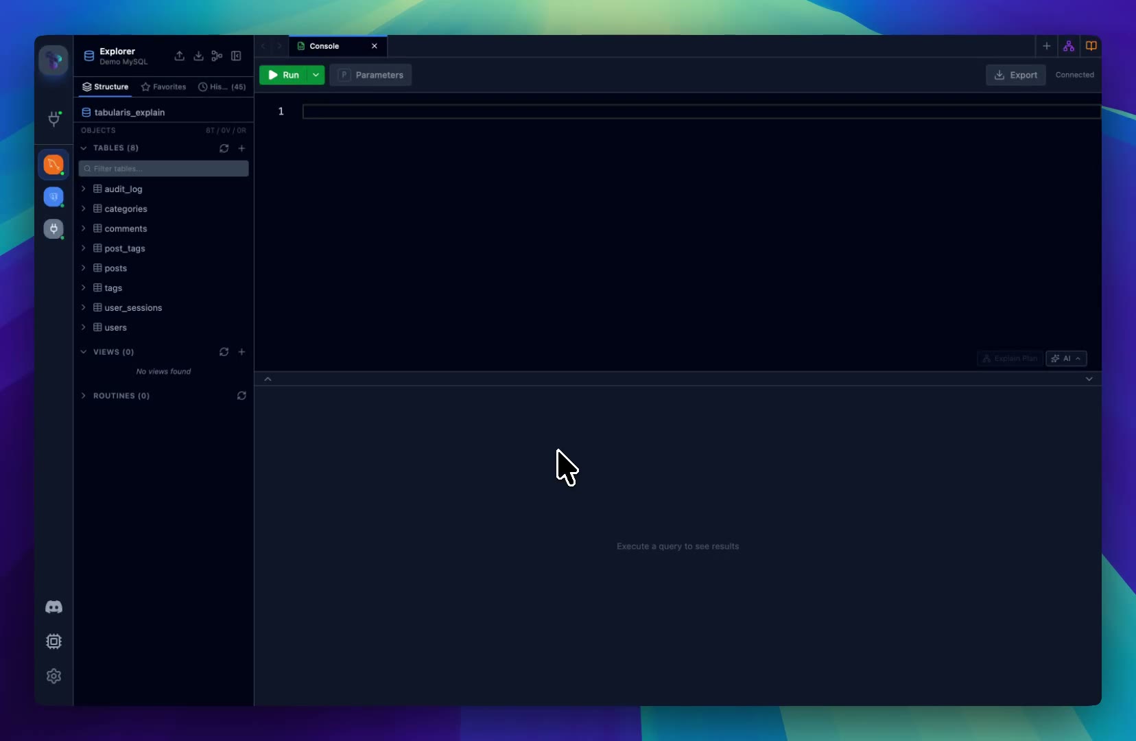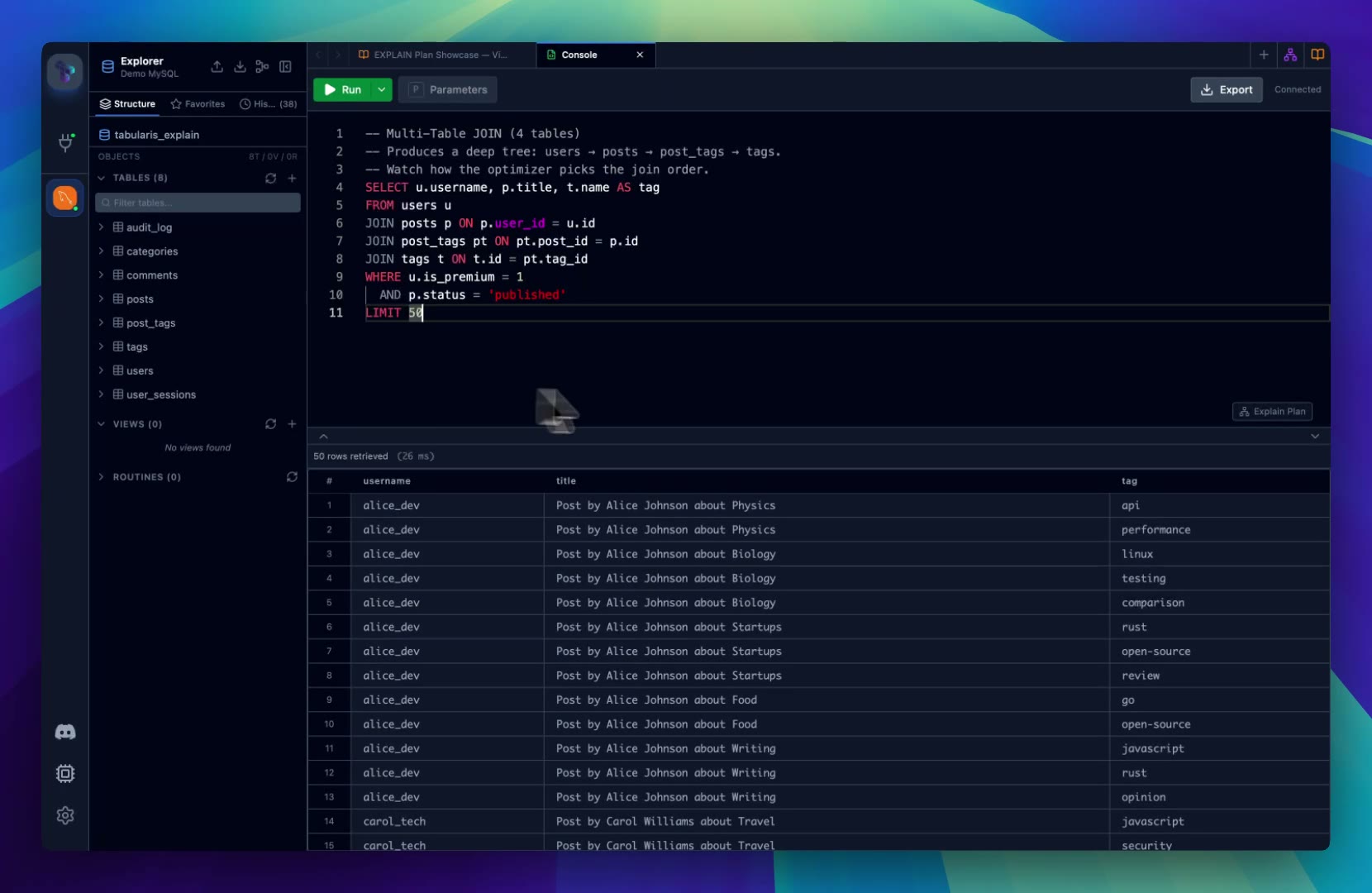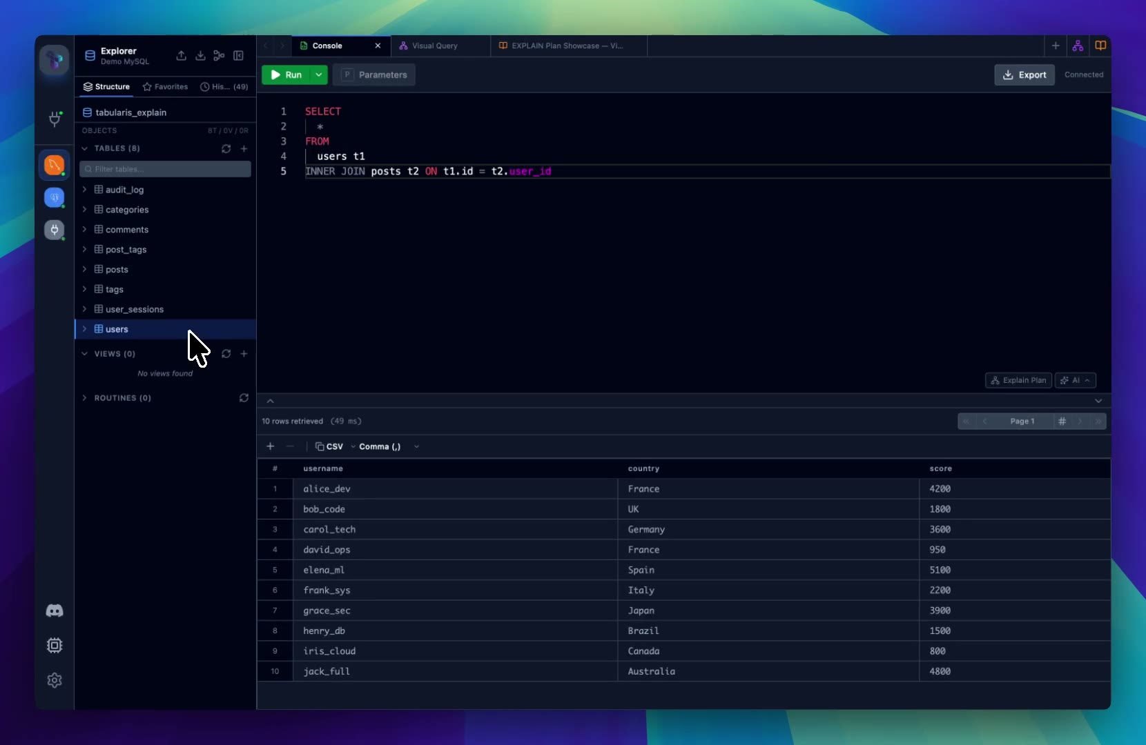 DemoVisual EXPLAIN Query Plan AnalysisTurn database execution plans into graph views, table details, raw output, and AI-assisted recommendations.